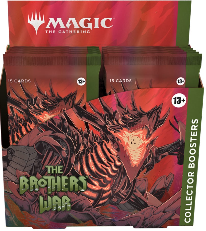 Long ago, The Brothers' War was fought. Each MTG THE BROTHERS WAR COLLECTOR BOOSTER pack includes 63 artifacts from the annals of Magic's past presented in the retro frame. Classic cards get a new look and many make their first retro appearance, ready to enhance any deck.